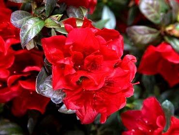 Rododendron “Canzonetta”. Вечнозеленый кустарник с плотной округлой кроной высотой около 40-60 см и шириной 80 см. Листья мелкие, темно-зеленые, глянцевые, длиной 2-3 см. Цветки карминно-красные, полумахровые диаметром 5-6 см. Цветет в мае-июне.