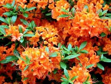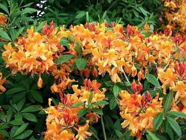 Rhododendron japonicum — Рододендрон японский. Родина Япония. Растет на открытых склонах, в горах. Считается одним из самых красивых видов среди листопадных рододендронов. Растет в виде сильноветвистого кустарника до 2 метров высотой. Листья продолговато-ланцетной формы, тонкие, зеленого цвета, который осенью меняется на оранжево-красный и его оттенки. Также декоративен во время осеннего окрашивания листьев. Цветки колокольчатой формы, до 8 см в диаметре, оранжевого цвета, ароматные, собраны по 6-12 штук в соцветиях-кистях. Цветение длится около месяца и происходит на голых ветках или одновременно с распусканием первых листочков. Зимостоек.