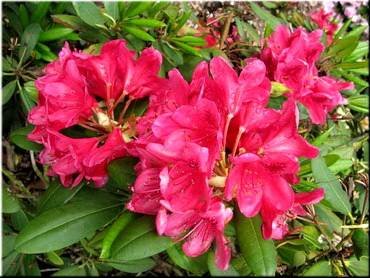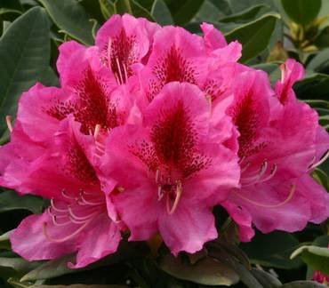 Rododendron “Haaga”. Куст плотный высотой 1,3 метра. Листья глянцевые, темно-зеленые, длиной 12-14см, почки красноватые. Цветки до 6-7см, темно-розовые с красно-оранжевыми веснушками и слегка волнистыми краями, в соцветиях по 17-20 шт. Цветет май-июнь.