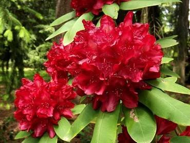 Rododendron “Nova Zembla”. (Нова зембла). Кустарник 150 см в высоту и в ширину, крона широкая и густая, с пряморастущими стеблями, рост побегов сильный и плотный. Листья темно-зеленые. Цветки рубиново-красные, с фиолетово-коричневой сердцевиной, с возрастом светлеют, собранные в компактные соцветия по 10-12 шт. Цветет в мае.