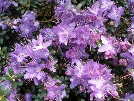 Rododendron “Buchlovice”. Вечнозеленый кустарник, с округлой формой куста, высотой 30-60 см. Годовой прирост до 3-4 см. Листья светло-зеленые, обладают пряным ароматом. Цветки мелкие, бледно-голубовато-фиолетовые, очень многочисленные. Цветет апрель-май.