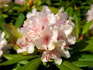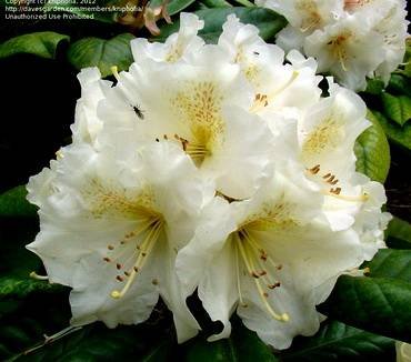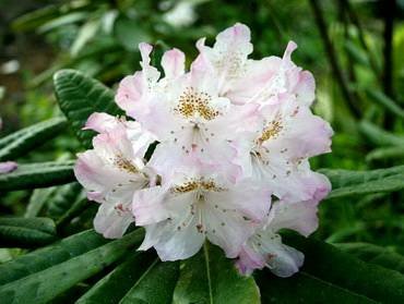 Rododendron “Calsap”. (Калсап). Вечнозеленый кустарник высотой до 130 см. Крона раскидистая. Ежегодный прирост в высоту и ширину 5-10 см. Листья темно-зеленые, эллиптические, кожистые, блестящие, длиной 10-12 см. Цветки диаметром до 7 см, белые с лиловым оттенком, верхний лепесток украшает большое фиолетовое пятно, собраны в соцветия по 10-15 штук. Цветет в мае-июне.