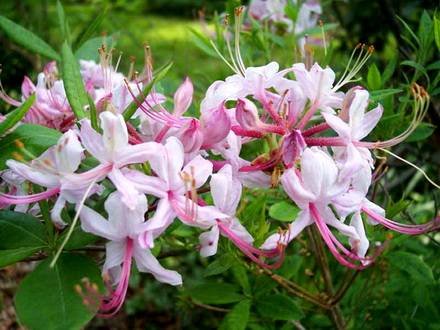 Rhododendron periclymenoides — Рододендрон голоцветковый. (Pinxterbloom Azalea, Pinxter Flower). Листопадный кустарник высотой 1-2 метра. Листья продолговатой формы, ярко-зеленые, до 8 см длиной и 3 см шириной, с ресничками по краю, ярко-зеленого цвета, осенью желтые. Цветки трубчатые, 3-4 см в диаметре, светло-розового цвета с выступающими тычинками, слегка ароматные, в шаровидных гроздьях. Зацветает с мая по июнь до появления листьев, цветение длится около двух недель. Растение медленнорастущее, прирост в год составляет всего 3-5 см. Достаточно морозостойкий.