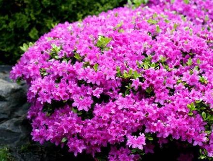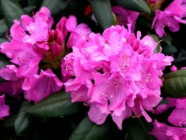 Rododendron “Rokoko”. Полувечнозеленый кустарник, подушковидной формы. Листья темно-зеленые, блестящие, с осени приобретают бронзовый оттенок. Цветы сочного малинового цвета, многочисленные.