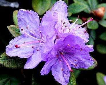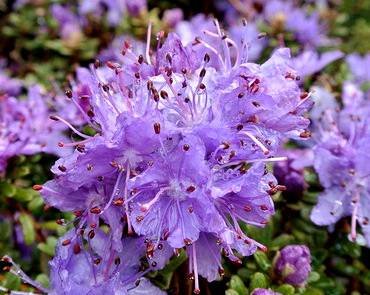 Rhododendron impeditum — Рододендрон плотный, импедитум. (Cloudland Rhododendron, Dwarf Purple Rhododendron). Вечнозеленый кустарник с раскидистой или округлой кроной до 60 см высотой. Листья яйцевидные, сине-зеленые, до 2 см длиной, хорошо сохраняются под снегом. Цветки широко-воронковидные и могут быть розовыми, белыми, лилово-розовыми, пурпурными, лососево-розовыми, карминными. Могут быть одиночными или в коротких соцветиях. Цветет с середины мая до середины июня, часто повторно в конце лета — начале осени. Растет очень медленно. Выносит легкую тень. Подходящий для альпинария.