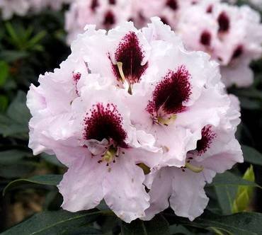 Rododendron “Krolowa Jadwiga”. (Королева Ядвига). Вечнозеленый куст сильнорослый, густоветвистый, с широким силуэтом, высотой до 1,5 метра. Листья блестящие, темно-зеленого цвета. Цветки нежно-розовые с ярким красивым бордовым пятном на верхнем лепестке, края лепестков сильно гофрированные, собраны в многоцветковые шаровидные соцветия. Цветет в первой половине июня.