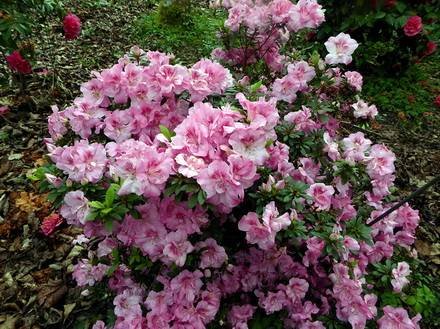 Rododendron “Kermesina”. Кустарник с плотной округлой кроной высотой около 40-60 см и шириной 80 см. Кустик нарастает медленно. Листва мелкая, овальная, темно-зеленая. Цветки простые, колокольчатые, розовые с белой каймой. Цветет май-июнь.