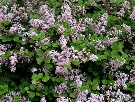 Syringa microphylla — Сирень мелколистная. (Littleleaf Lilac). Синоним: Syringa pubescens var. microphylla. Происхождение — Китай, Корея. Компактные кустарники высотой и шириной 1,5 метра, с возрастом разрастается в ширину, с тонкими, частично свисающими, опушёнными побегами. Листья супротивно расположенные, круглые у основания и заостренные на вершине, 4-6 см длиной и 3-5 см шириной. Листовые пластины с лицевой стороны насыщенно-изумрудные, с изнаночной — намного бледнее. Цветки мелкие, душистые, собраны в небольшие пирамидальные разветвлённые соцветия длиной 3-10 см. Бутоны лилово-розовые, цветки светло-лиловые с белыми верхушками. Цветет в июне. Цветки долго сохраняются на дереве. Растёт медленно. Светолюбива, выносит полутень. После радикальной стрижки цветки сирени становятся крупнее, а цветение обильнее. Зимостойкость высокая до -29°С.