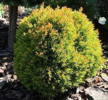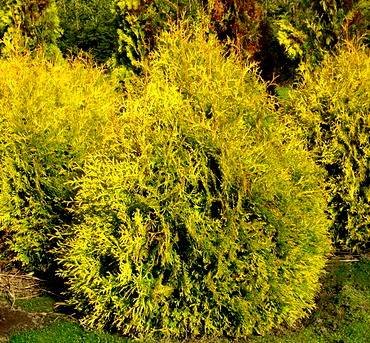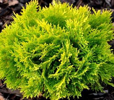 Thuja “Amber Glow”. Карликовый сорт высотой до 80-90 см, крона в виде полусферы. Листва золотисто-желтая.