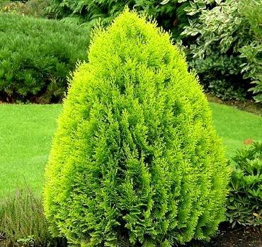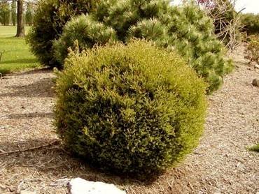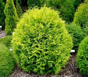 Thuja Golden Globe”. (Голден Глоб). Во взрослом возрасте имеет форму идеального шара диаметром 60 см яркого, золотисто-желтого цвета. Причем этот оттенок не меняется в течение всего сезона.