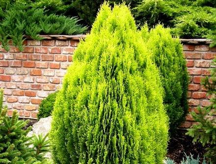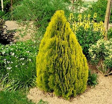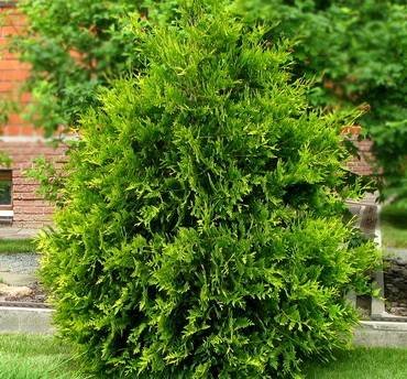 Thuja “Magnifica”. Компактный и плотноветвистый сорт, образует крону в форме кегли высотой 2-3 метра. Хвоя золотистая.
