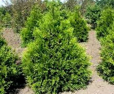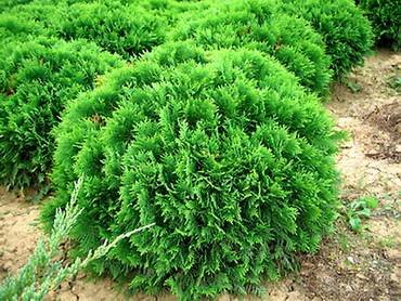 Thuja “Umbraculifera”. Растения высотой 80-90 см, диаметром до 100 см. Крона полукруглая или плоско закругленная. Ветви и боковые ветки более или менее прямые, очень густостоящие, веточки часто слегка подкручены в плоскости. Хвоя чешуевидная, очень тонкая, голубовато-зелёная.