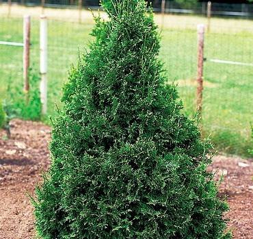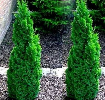 Thuja “Smaragd”. (Смарагд). Конусовидный сорт высотой до 2 метров. Веточки глянцевые, темно-зеленые и летом и зимой. Получаются прекрасные живые изгороди. Растет медленно, до 10 сантиметров в год. Легко переносит обрезку, пригодна для фигурной стрижки, благодаря чему позволяет создавать оригинальные формы.