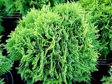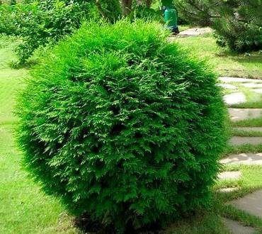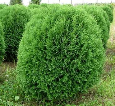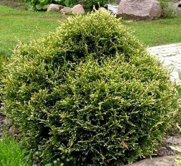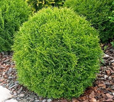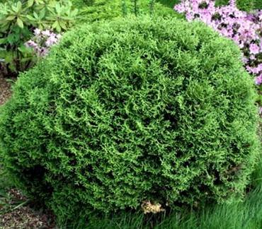 Thuja “Sphaerica”. Низкорослая шаровидная форма, со временем достигает в высоту около 1 метра, приобретая яйцевидную форму. Ветви густо стоящие, достаточно тонкие, на концах курчавящиеся. Хвоя чешуевидная.