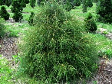 Thuja “Filiformis”. (Филиформис) Приземистая конусовидная, иногда стоговидная форма высотой почти до 1,5 метров. Ветви длинные, прутовидные, прямые и длинносвисающие, округлые в сечении, побеги мало или совсем не разветвлены, сжатые или плоские. Хвоя чешуевидная, редкая, длиннозаострённая, светло-зеленая, зимой она приобретает коричневый оттенок, хвоя прошлых лет с резко выделяющимися смоляными желёзками.