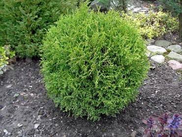 Thuja Daniса”. (Даника). Шаровидная карликовая форма высотой до 50-70 см. Ширина больше высоты. Веточки расположены вертикально, свежезелёной окраски, зимой коричневато-зелёные. Вееровидные побеги придают кроне волнистый вид. Кора серо-коричневая или красноватая, отслаивающаяся. Хвоя густая, мягкая, блестящая чешуйчатая зеленого цвета, зимой приобретает коричневатый оттенок. Медленнорастущий сорт, годовой прирост — не более 5 сантиметров.
